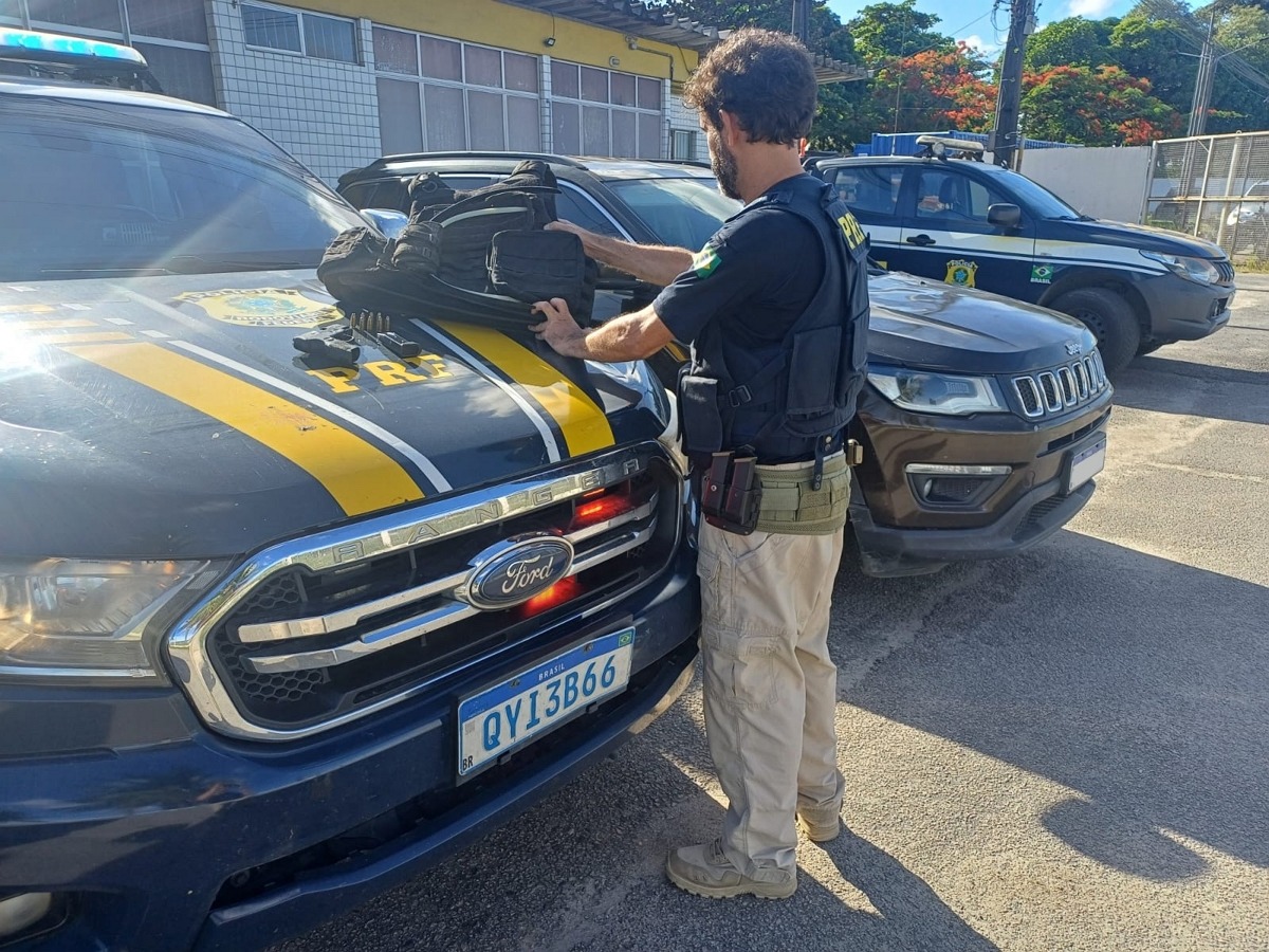 Pistola, colete e duas algemas foram apreendidos em um carro roubado, na terça-feira (25), durante uma fiscalização da Polícia Rodoviária Federal (PRF). O motorista que transportava o material foi detido na BR 101, em Jaboatão dos Guararapes, no Grande Recife.