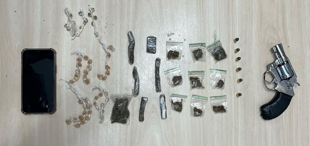 Com ele foram apreendidos um revólver calibre .32 com seis munições intactas, 16 invólucros de maconha, 55 pedras de crack e um celular. A ocorrência foi apresentada à Polícia Civil, para que fossem adotadas as medidas legais cabíveis.