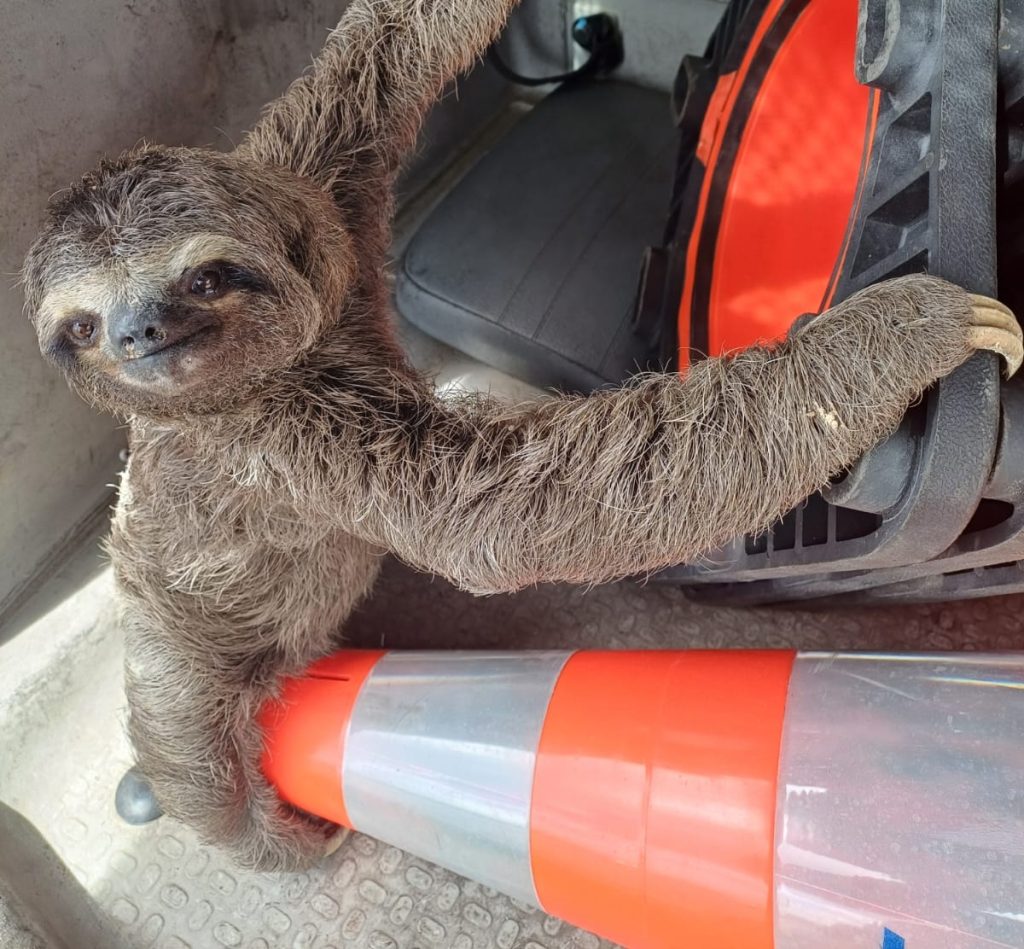 Policiais realizavam uma ronda no Km 8 da rodovia, quando avistaram o bicho-preguiça rastejando pela faixa da direita da rodovia. A equipe sinalizou o local e conseguiu pegar o animal com os devidos cuidados para não machucá-lo.