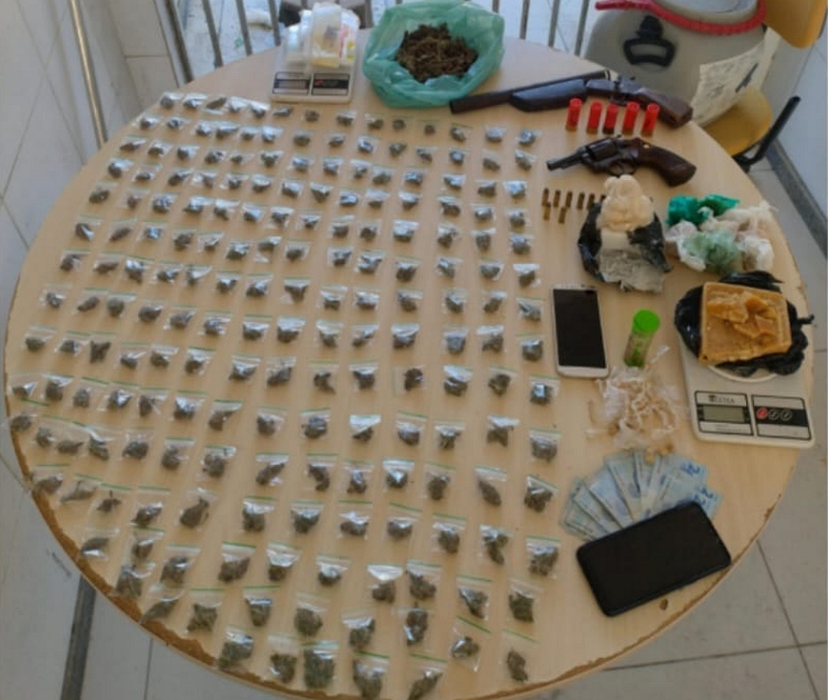 Foram apreendidos 190 embalagens zip lock de maconha, 78 g da mesma substância, 1 kg de crack, 69 pedras da droga, 420 g de cocaína, um revólver calibre 38, uma espingarda calibre 12, 17 munições, um celular, duas balanças de precisão, uma motocicleta e R$ 30 em espécie.