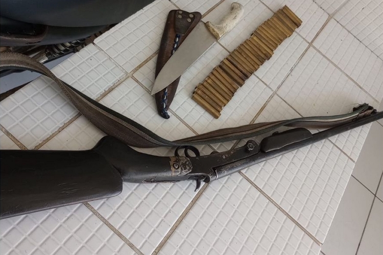 Diante da informação, a equipe policial se deslocou até a residência indicada, onde foi recebida por familiares que aguardavam a chegada da viatura. No local, o idoso entregou espontaneamente uma espingarda industrial calibre 36, acompanhada de 32 cartuchos, sendo 11 deflagrados e 21 intactos. Além da arma, também foi entregue uma faca tipo peixeira, que o homem portava presa à cintura.