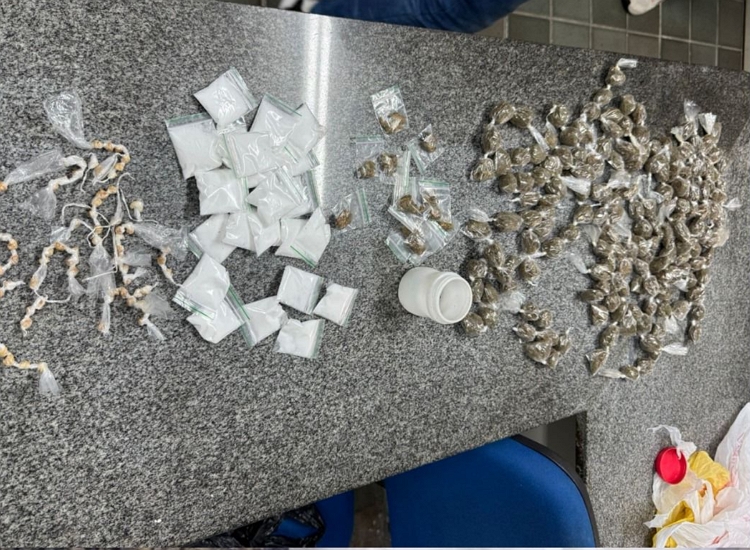 Em uma sacola plástica, havia 167 invólucros com maconha, 13 invólucros com haxixe, 71 invólucros com crack e 23 invólucros com cocaína, que ele se recusou a revelar a procedência.