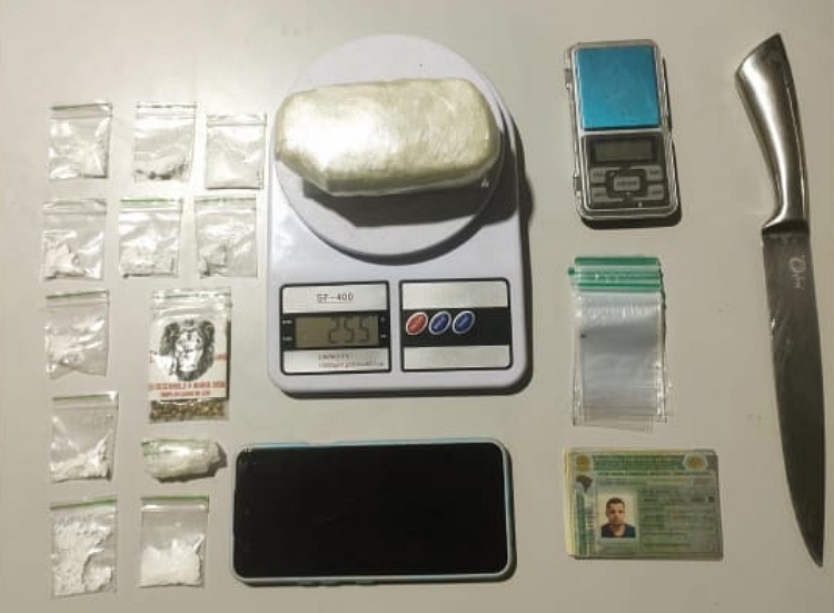 Ao fazer rondas no Sítio Pacas, o efetivo se deparou com o suspeito que, no momento da abordagem, estava de posse de 255g de cocaína e outros 12 ziplocks da mesma droga, 5g de sementes de maconha, duas balanças de precisão, sacos para embalagem e um facão.