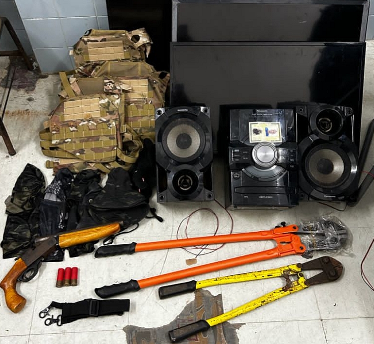 Foram apreendidos no local uma espingarda calibre 12 com três munições, um big big de maconha, um celular, dois alicates para cortar cadeados, três coletes balísticos com capa camuflada e placa, três televisões, um aparelho de som, cinco pares de luvas, três toucas tipo balaclavas e uma bandeira para arma longa.