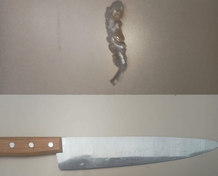 Durante a revista pessoal, foram encontrados uma faca peixeira na cintura e cinco pedras de crack no bolso da camisa. O suspeito afirmou à polícia que a arma seria para sua defesa e que a droga teria sido adquirida na Rua Felipe Camarão, em Lajedo, por R$ 50,00, de uma mulher cuja identidade ele disse desconhecer.