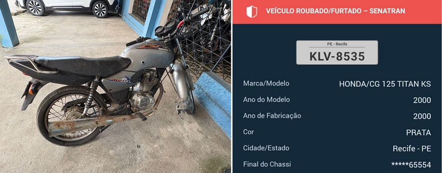 De acordo com a Polícia Militar, após consulta no sistema, foi constatado que a moto possuía restrição de roubo. O veículo foi recolhido e entregue à Delegacia de Polícia Civil de Quipapá, que ficará responsável pela investigação do caso.