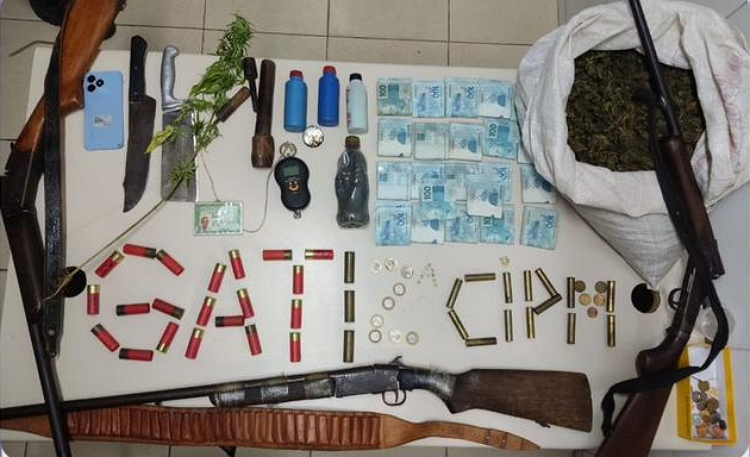 No total, foram apreendidos na propriedade, além da plantação que foi incinerada, 3,5kg de maconha pronta para o consumo, três espingardas de calibres 12, .32 e .20; 36 cartuchos de calibres variados, três frascos de chumbo, um frasco de pólvora para recarga e a quantia de R$ 22.014,75 em espécie.
