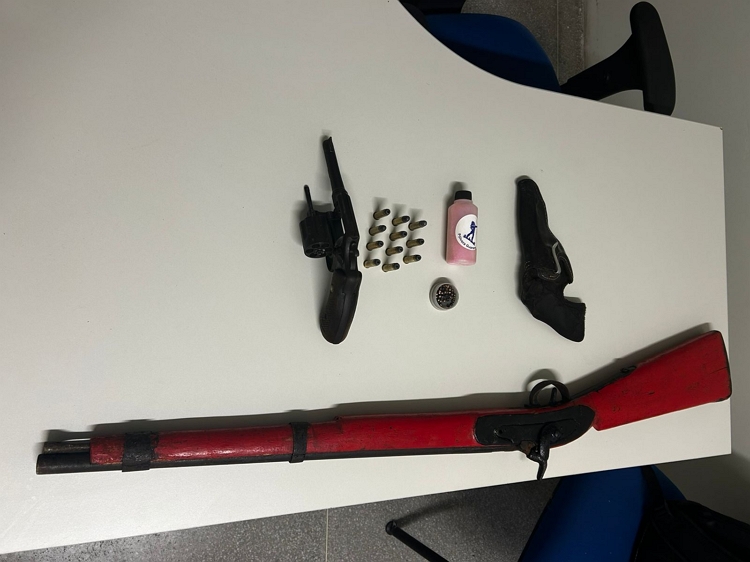 Foram apreendidos: um revólver calibre .38, diversas munições, uma espingarda, além de um tubo de pólvora e uma caixa de espoletas contendo cerca de 50 unidades.