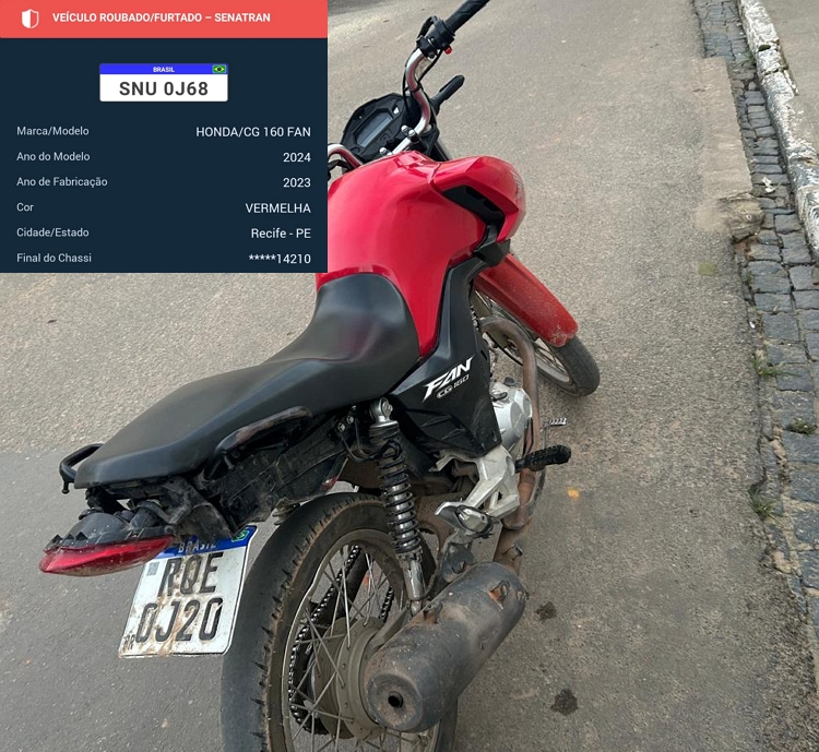 Durante abordagens de rotina, o efetivo identificou uma Fan 160 vermelha, placa RQE-0J20, circulando em desacordo com as normas de trânsito. Na vistoria, foram constatados sinais identificadores adulterados.