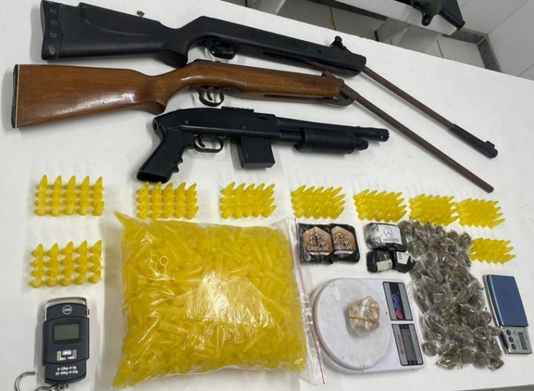 Na tentativa de escapar, o homem abandonou uma sacola, dentro da qual os policiais encontraram 175 pinos de cocaína, 329g de haxixe, 65 porções de maconha embaladas em ziplocks, três balanças de precisão, duas espingardas de pressão, um simulacro de calibre 12 e um saco com embalagens para drogas.