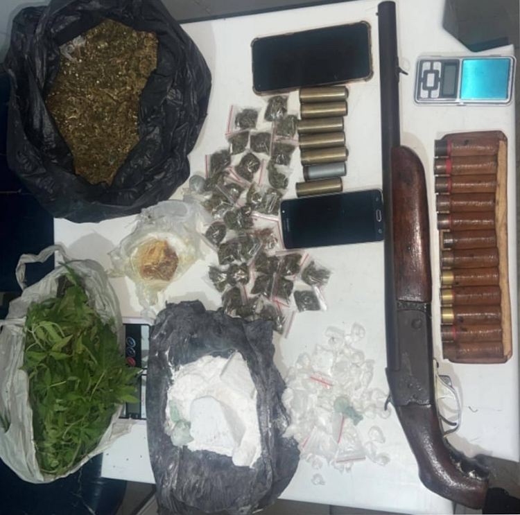 Em ato contínuo, foi feita a verbalização para o dono da casa, que ao notar a presença dos policiais fugiu pulando muros da vizinhança. No interior da residência, a equipe apreendeu uma escopeta calibre 12 de cano cerrado com 19 munições, 1,136kg de maconha, 425g de cocaína, 63g de crack, duas balanças de precisão e dois celulares.