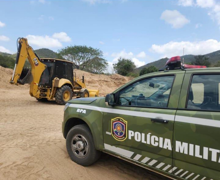 No mesmo local, os policiais identificaram uma máquina escavadeira em operação e constataram a retirada ilegal de areia. O responsável pelo equipamento admitiu não possuir licenciamento ambiental, incorrendo no crime previsto pelo Artigo 55 da Lei nº 9.605/98 (Crimes Ambientais).