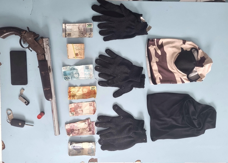 Os policiais iniciaram diligências e conseguiram localizar e abordar Welton Siqueira da Silva, Paulo André Alves da Silva, e David Juan Silva de Macedo . Com eles foram encontrados uma espingarda calibre 12 com uma munição intacta, dois celulares, a quantia de R$ 4.181,00 em espécie, além de luvas, toucas ninjas e um veículo Gol sem restrição de roubo ou furto.