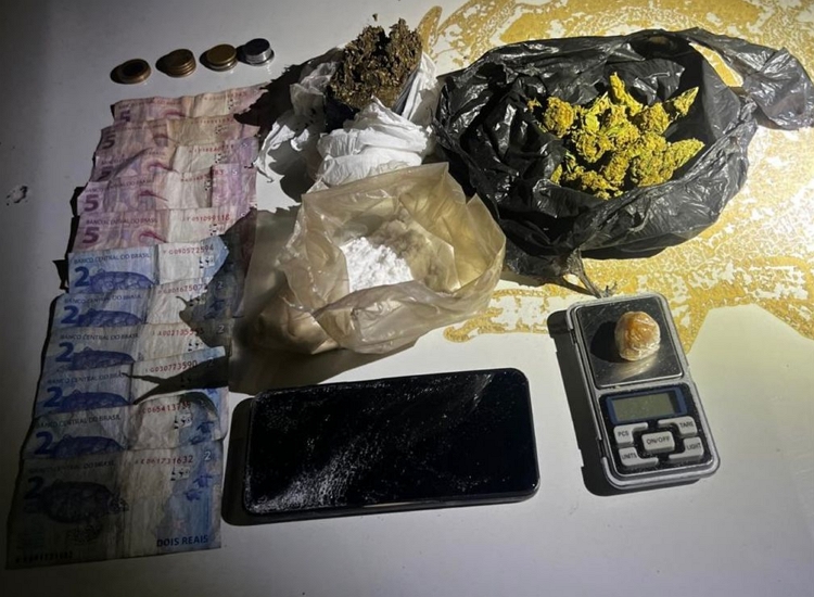 Durante rondas na localidade, o suspeito foi abordado e revistado. Com ele, os policiais encontraram 170 gramas de cocaína, 190 gramas de maconha, 9 gramas de crack, uma balança de precisão, um celular e R$ 45,00 em espécie.