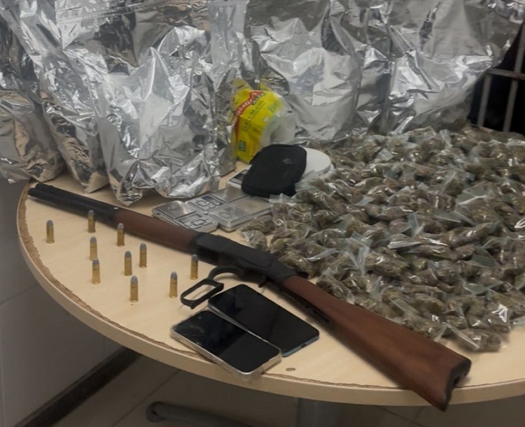 No total, foram apreendidos sete quilos e 301 big bigs de maconha, três balanças de precisão, uma espingarda, munições calibre .44 e dois celulares.