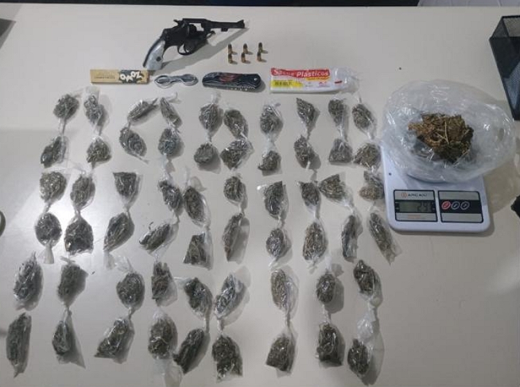 Ao ser abordado, o suspeito foi encontrado com um revólver calibre 32, marca Taurus, com seis munições intactas, além de dois “dólar” de maconha, uma tesoura e um pacote de seda. Questionado, ele afirmou possuir a arma para defesa pessoal e se declarou usuário de drogas, indicando que havia mais entorpecentes em sua residência.