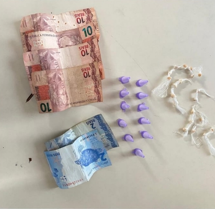 Durante a busca pessoal, os militares encontraram 11 pinos plásticos contendo substância análoga à cocaína, pedras de crack e uma quantia em dinheiro.