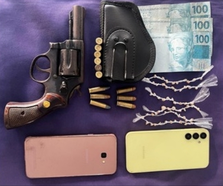 Durante o acompanhamento, o homem acabou se desequilibrando e caindo, sendo imediatamente detido pelos policiais. Na revista e verificação do material, foram encontrados um revólver calibre .38, 12 munições (sendo uma pinada), 60 pedras de crack, R$ 300 em espécie e dois aparelhos celulares.