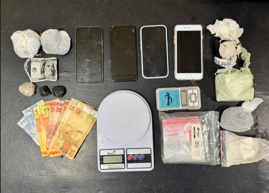 Durante a abordagem, a equipe policial encontrou com o grupo uma quantidade significativa de entorpecentes e materiais utilizados na comercialização ilícita. No total, foram apreendidos 335 gramas de cocaína, 55 gramas de crack, 75 gramas de maconha, além de duas balanças de precisão, embalagens plásticas, cinco celulares e R$ 194,00 em espécie.