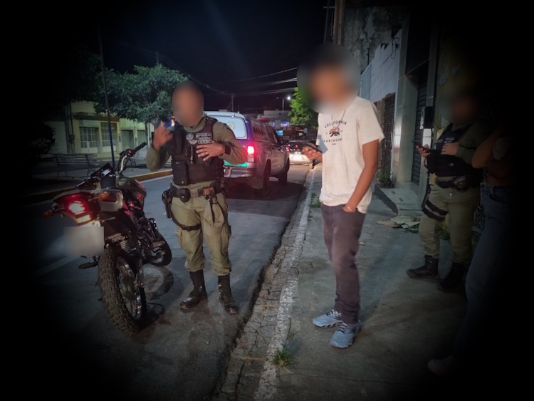 Na noite deste sábado (15), policiais militares do 9º Batalhão realizaram a apreensão de uma motocicleta conduzida por um adolescente de 17 anos na Avenida Coronel Alfredo Duarte, área central de Águas Belas. O jovem pilotava uma Yamaha Crosser sem capacete e sem escapamento, chamando atenção pelo barulho excessivo e perturbando o sossego da população.
