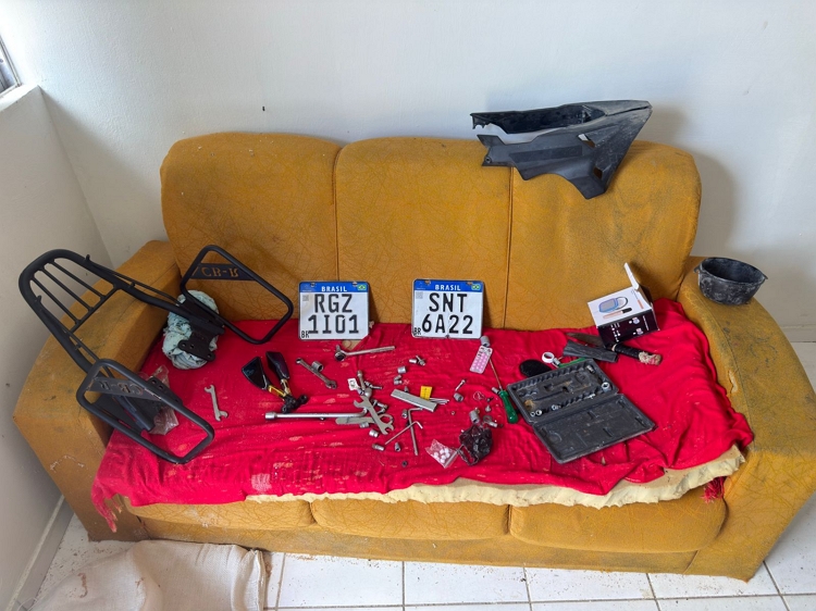 Durante a ação, os policiais localizaram um ponto utilizado para o desmonte irregular de motocicletas. No local, foi encontrada uma moto com registro de roubo, que foi imediatamente recuperada, diversas peças e duas placas de motos.