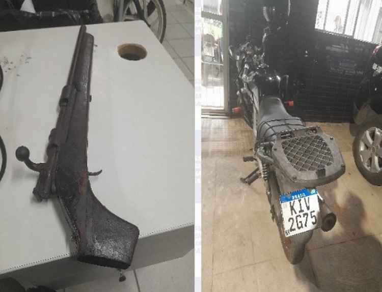 Durante nova conversa, o homem acabou indicando aos PMs uma construção onde estavam escondidos uma arma de fogo calibre 12 e as roupas utilizadas no assalto. Em seguida, levou a equipe até um matagal nas proximidades, onde foi encontrada a motocicleta roubada, que apresentava restrição e foi confirmada como a mesma subtraída no dia da ocorrência.
