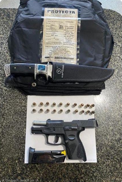 Durante o patrulhamento pela região, os policiais perceberam a movimentação suspeita de dois homens e decidiram abordá-los. Na busca pessoal, foi encontrada com um deles uma pistola calibre 9mm carregada com vinte munições, além de um documento de porte que não correspondia ao armamento apreendido. Ele também apresentou registro de outra arma, que não estava em sua posse.