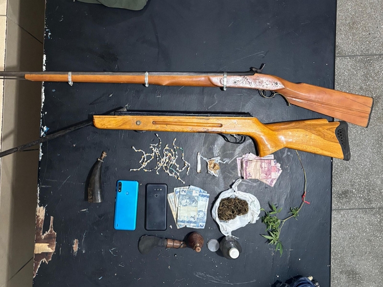 Durante a varredura no local, os policiais encontraram uma arma de fogo artesanal carregada e pronta para uso ao lado da porta. Também foram apreendidos 23 gramas de maconha, uma porção de cocaína, 100 pedras de crack escondidas sob uma cerâmica, além de 16 gramas de crack em porções maiores. No imóvel havia ainda uma espingarda calibre 5.5 e dois aparelhos celulares.