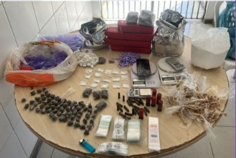 Dando continuidade à ocorrência, o indivíduo informou aos policiais que havia mais material ilícito escondido em uma casa abandonada na comunidade. No local indicado, foram apreendidas grandes quantidades de entorpecentes, munições, balanças de precisão e outros apetrechos comumente utilizados no tráfico de drogas.