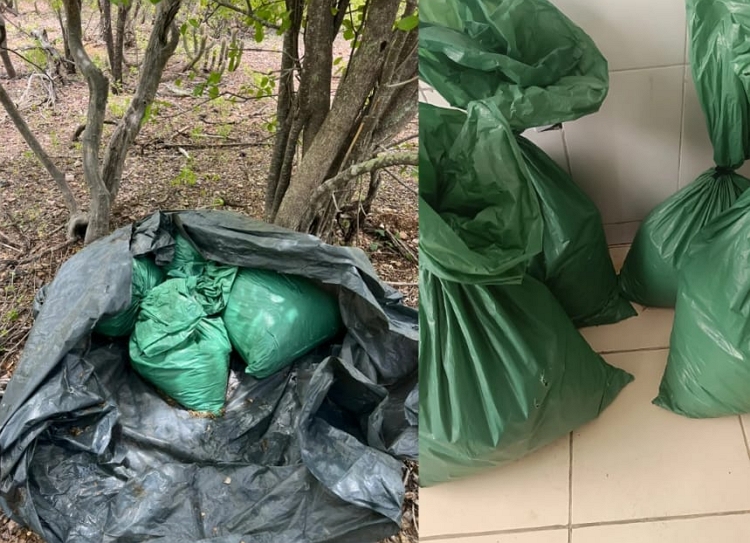 Os policiais se deslocaram até a Fazenda Juá, onde realizaram incursões em uma área de mata. Durante as buscas, foi localizada uma lona preta camuflada em meio à vegetação. Sob o material, os militares encontraram quatro sacos contendo maconha já pronta para consumo e comercialização.