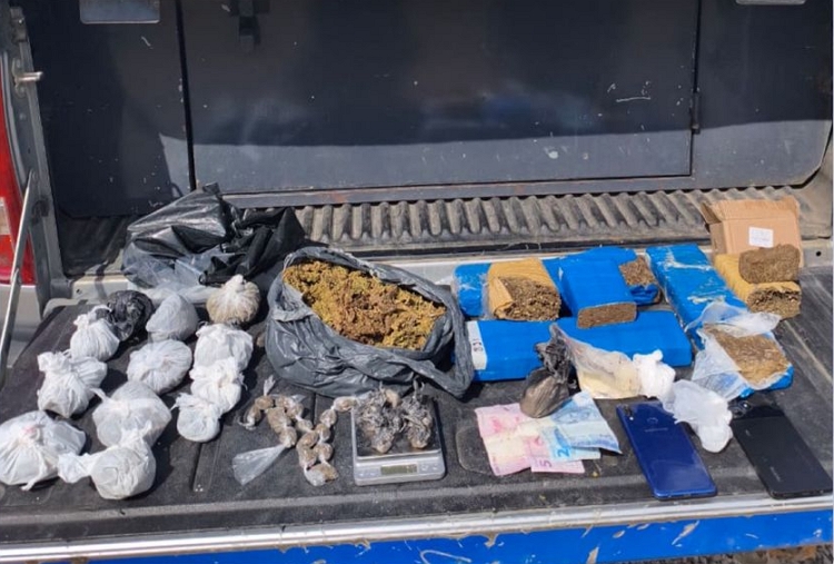 Dando continuidade às diligências, os policiais realizaram uma varredura na área e encontraram, em uma residência abandonada nas proximidades, uma quantidade maior de drogas. Ao todo, foram apreendidos aproximadamente 4 quilos de maconha, 250 gramas de cocaína e 50 gramas de crack.