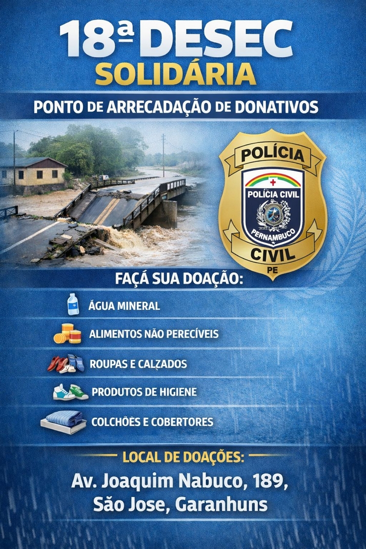 Em meio à dor causada pelas fortes chuvas que atingiram municípios do Agreste pernambucano, um gesto de humanidade e empatia se transforma em esperança. A 18ª Delegacia Seccional de Polícia Civil, sediada em Garanhuns, lançou a campanha “18ª DESEC Solidária”, mobilizando a população para ajudar famílias que perderam bens e enfrentam dificuldades após os recentes temporais.