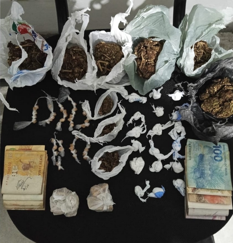 Na sacola dispensada pelo suspeito foragido, os policiais encontraram uma grande quantidade de entorpecentes e dinheiro em espécie: aproximadamente 50 gramas e 48 pedras de crack, 16 pinos de cocaína, cerca de 163 gramas de maconha, além da quantia de R$ 1.011,00.
