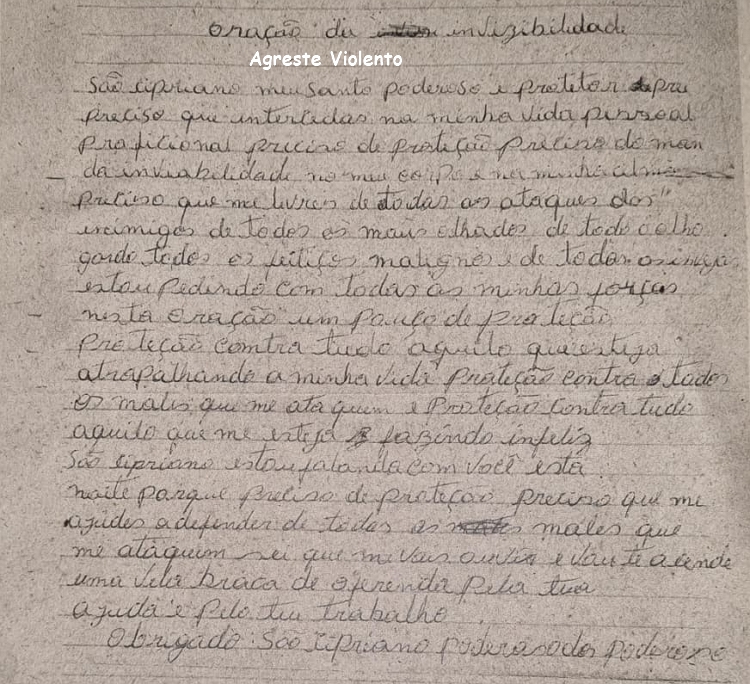 O que mais chamou a atenção dos policiais, no entanto, foi o papel encontrado com o suspeito: nele estava escrita uma oração de “encantamento”, que, segundo o próprio homem, deveria ser rezada para que ele não fosse visualizado, numa tentativa simbólica de escapar da prisão.