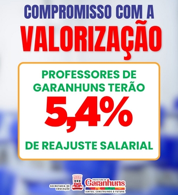 A Prefeitura de Garanhuns garantiu um reajuste salarial de 5,4% para todos os professores da Rede Municipal de Ensino, percentual igual ao instituído pelo Governo Federal. O aumento é linear e passa a ser pago a partir do mês de fevereiro, beneficiando todos os profissionais do magistério.