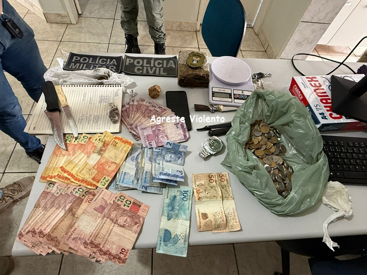 Durante a incursão, o suspeito foi preso em flagrante e, com ele, os policiais apreenderam um vasto material relacionado ao tráfico de drogas: mais de meio quilo de maconha; 36 gramas de crack não fracionado; diversas pedras de crack prontas para comercialização; uma balança de precisão; uma faca utilizada para o fracionamento dos entorpecentes; um aparelho celular; um caderno com anotações compatíveis com a contabilidade do tráfico; além de quantia superior a R$ 1.000,00 em dinheiro, proveniente da venda ilícita.