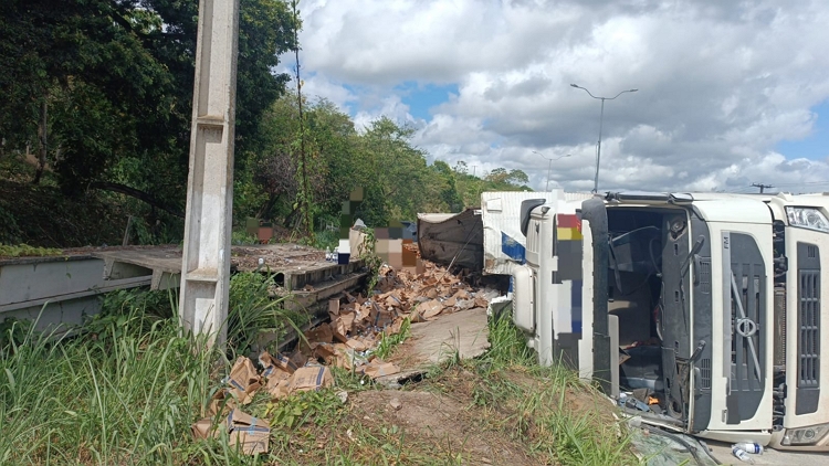 De acordo com informações da Polícia Rodoviária Federal (PRF), o motorista de um caminhão perdeu o controle da direção, fazendo com que o veículo tombasse às margens da rodovia.