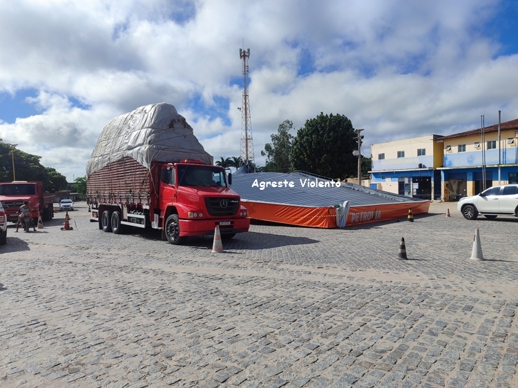 COBERTURA DE POSTO DESABA APÓS CAMINHÃO COM CARGA ALTA ATINGIR ESTRUTURA EM LAJEDO