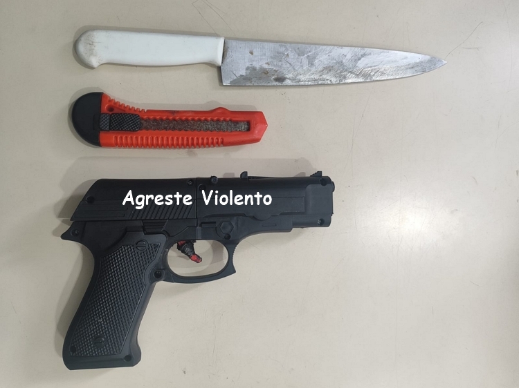 Durante a abordagem, os policiais encontraram com o homem uma faca e um estilete. Com o apoio da ROCAM, foi realizada uma varredura no local, momento em que os militares localizaram um simulacro de pistola — uma pistola de brinquedo — escondido debaixo de um veículo. Segundo a PM, o objeto teria sido arremessado pelo imputado ao perceber a aproximação da viatura.