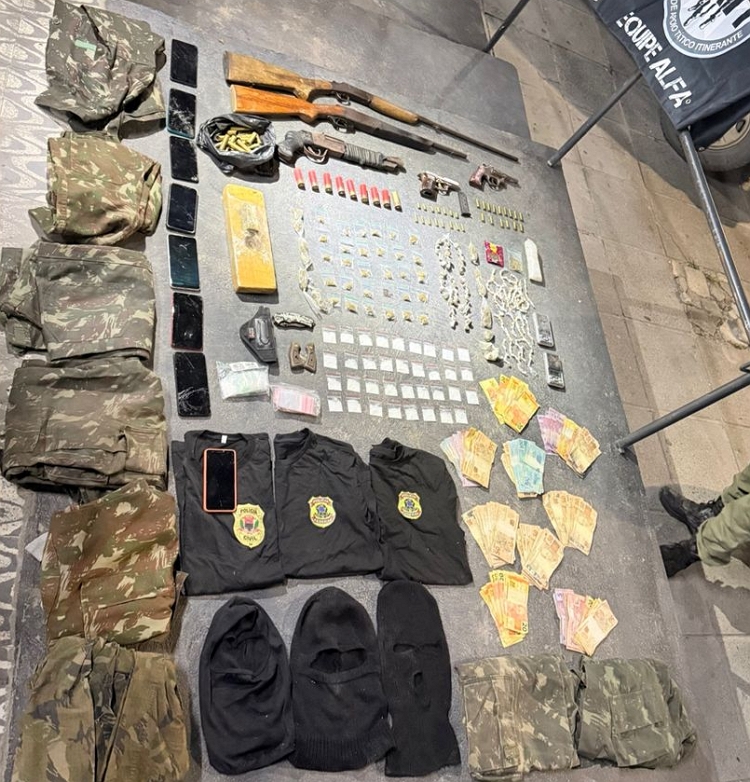 Além disso, também foram encontrados uniformes das polícias Civil e Federal, além de fardamento do Exército, o que levanta a suspeita de que os criminosos poderiam utilizar o material para se passar por agentes de segurança.