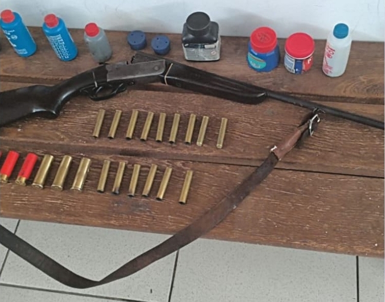 Diante das informações, o efetivo realizou diligências na área indicada e localizou uma espingarda calibre .36, em avançado estado de oxidação, além de 15 munições do mesmo calibre — sendo 9 intactas e 6 deflagradas. Também foram apreendidas 7 munições calibre .16 carregadas, bem como recipientes contendo insumos para recarga, entre eles chumbo, pólvora e espoletas.