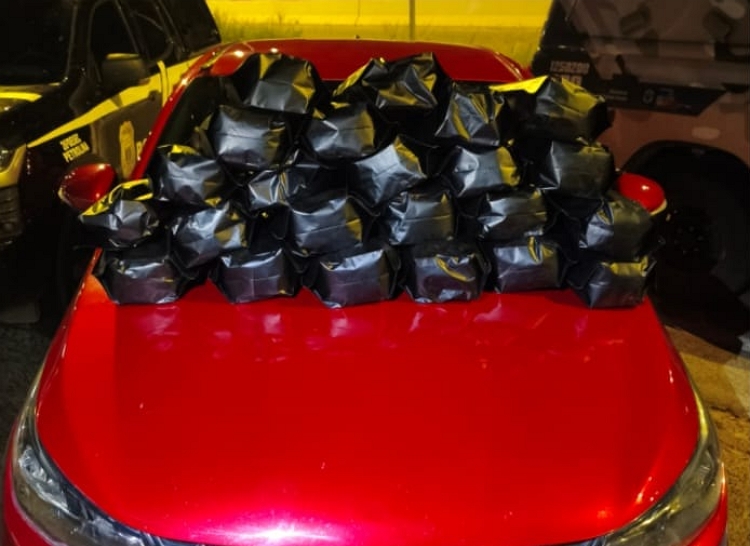 Durante a vistoria no veículo, os policiais encontraram 23 invólucros contendo substância análoga à maconha, totalizando aproximadamente 12,5 quilos.