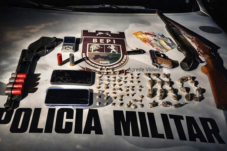 Com ele, os policiais apreenderam uma espingarda calibre 12, uma espingarda calibre 36, uma pistola calibre .22, um garruchão, quatro munições calibre .22, seis munições calibre 12, 59 pedras de crack, 23 bigs de maconha, uma balança de precisão, R$ 97,00 em espécie e dois aparelhos celulares.