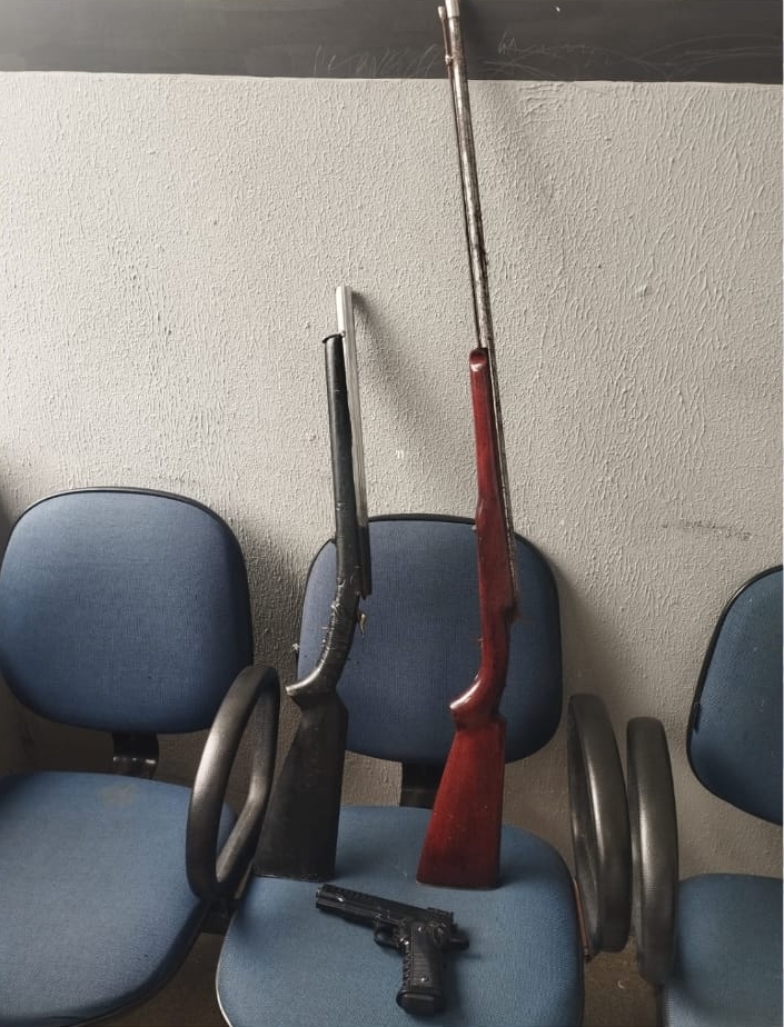 Ao abrirem a porta da residência, os policiais visualizaram na sala duas espingardas de fabricação artesanal e um simulacro de pistola. Diante da situação, os suspeitos receberam voz de prisão e foram conduzidos juntamente com o material apreendido para a Delegacia de Polícia Civil de Lajedo, onde foram adotadas as medidas cabíveis.