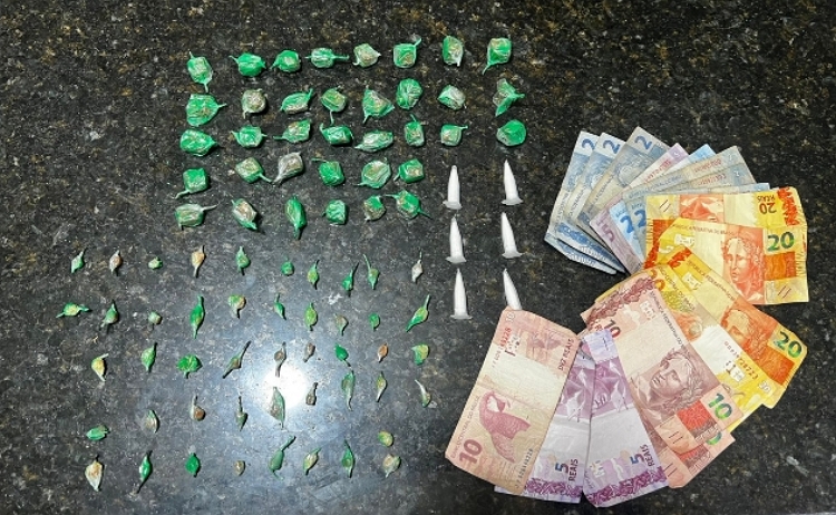 Durante a revista, foram encontradas com o suspeito 47 pedras de crack, 36 porções de maconha, conhecidas como “big big”, além de 6 pinos de cocaína. Também foi apreendida a quantia de R$ 141,00, valor que, segundo a polícia, é oriundo da comercialização das drogas.