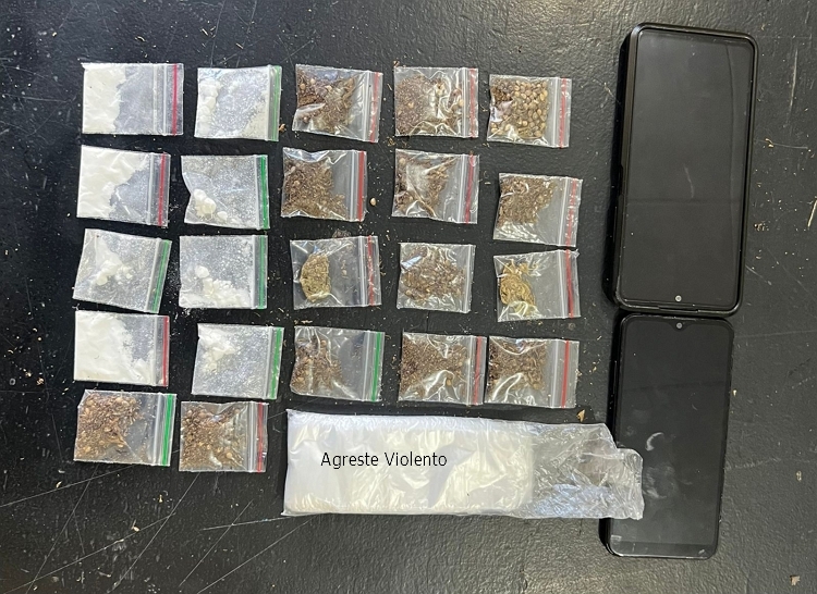 Os policiais realizaram buscas na localidade e conseguiram localizar o veículo suspeito, que foi abordado. Durante a revista no automóvel, foi encontrada uma sacola contendo 14 embalagens do tipo zip lock com maconha e 8 zip locks com cocaína. Também foi apreendida outra sacola com diversos plásticos utilizados para embalar drogas.