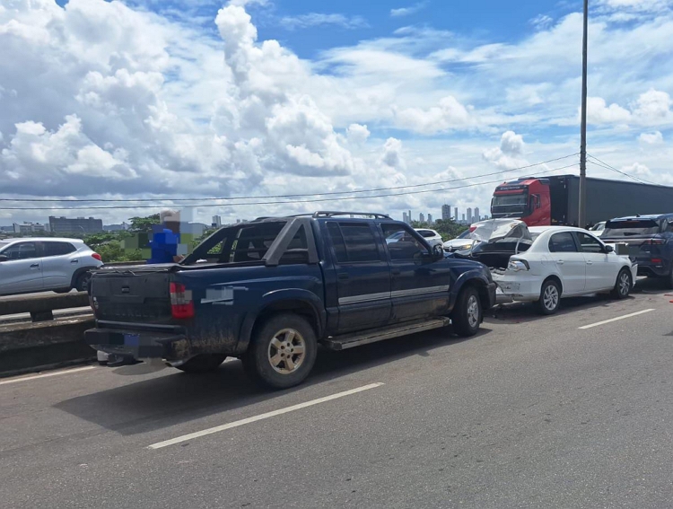 De acordo com as informações, o trânsito estava lento no momento da colisão, quando uma caminhonete não conseguiu frear a tempo e acabou atingindo uma motocicleta e um carro. Com o impacto, a moto ficou imprensada entre os veículos, provocando um engavetamento que ainda envolveu outro automóvel.
