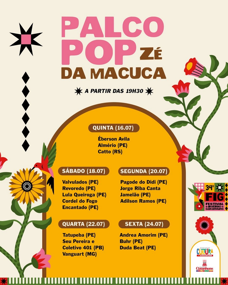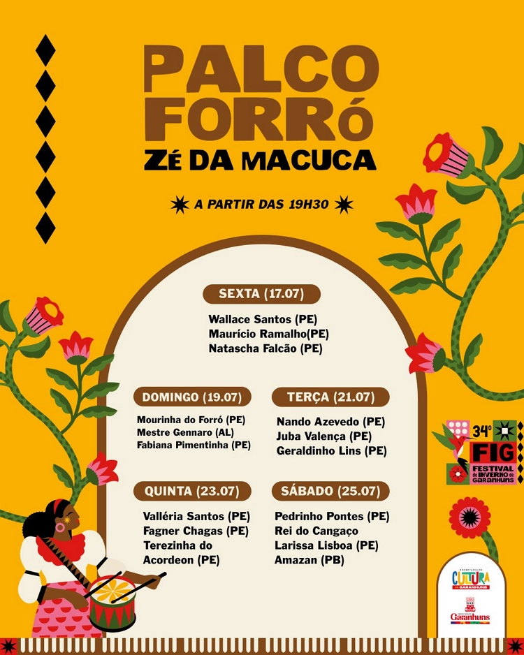 MÚSICA — No 34º FIG, a música vai além da Praça Mestre Dominguinhos. Contando com mais de 20 polos, dentre eles, o Palco Estação, no Centro Cultural Alfredo Leite Cavalcanti, que trará apresentações intimistas; o Palco Pop e o Palco Forró Zé da Macuca, que este ano está de volta ao Parque Euclides Dourado; e o Palco Instrumental Paulo Rafael, no Parque Ruber van der Linden. A novidade desse ano é o Palco 87 FM, Palco que fica localizado em frente ao Parque Euclides Dourado, na avenida Júlio Brasileiro.