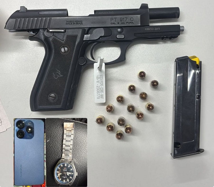 Durante a ocorrência, foram apreendidos uma pistola calibre 9mm, 14 munições intactas do mesmo calibre, além do relógio subtraído e um celular deixado pelo suspeito no local da ação.