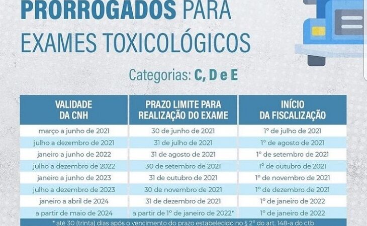 Por conta da pandemia de Covid-19, Contran estabeleceu novos prazos para realização do teste O Conselho Nacional de Trânsito (Contran) prorrogou os prazos para a realização do exame toxicológico periódico para o condutor habilitado nas categorias C, D e E. Publicadas na edição desta quarta-feira, 28, do Diário Oficial da União (DOU), as novas datas foram decididas por conta da pandemia de covid-19, com amplo debate dentro do Fórum Permanente para o Transporte Rodoviário de LER NOTÍCIA